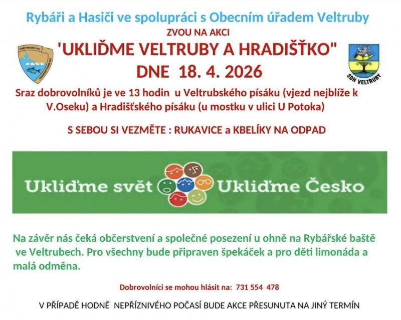 Napsal uživatel administrator dne Pá, 17/04/2026 - 07:19. Při akci Ukliďme Veltruby a Hradišťko 18.4.2026 lze si splnit rybářskou brigádnickou povinnost.