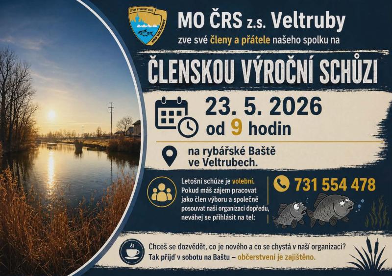 Napsal uživatel administrator dne Út, 28/04/2026 - 12:55. Členská výroční schůze se koná 23.5.2026 od 9:00 na rybářské Baště ve Veltrubech.